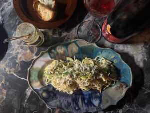 アルコール分が飛んだら、パスタの茹で汁とバター、カレスを入れて馴染ませる。