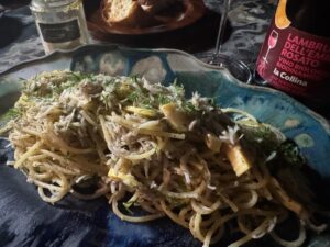 筍と釜揚げちりめんを入れて軽く炒めて、白ワインを少し。